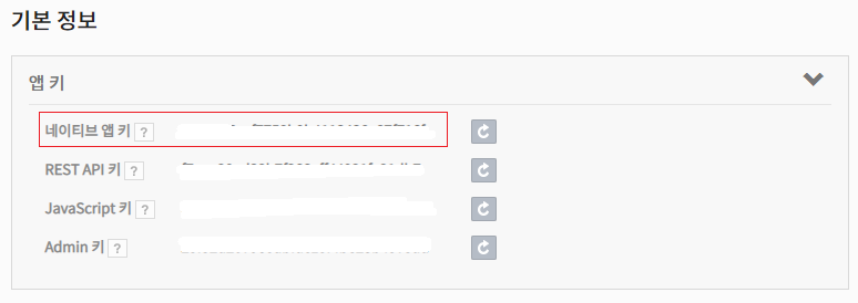 5) 페이지 상단의 [네이티브 앱 키], 등록한 [패키지명], [키 해시]를 사용합니다.