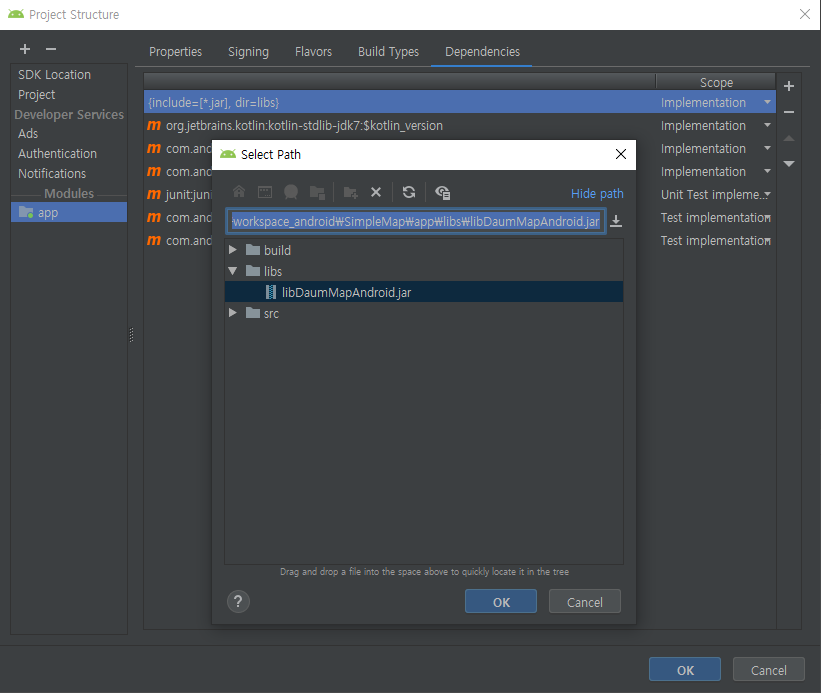 3) File>Project Structure>Dependencies 에서 +버튼을 클릭해서, Jar dependency 를 선택해서 libDaumMapAndroid.jar 파일을 추가