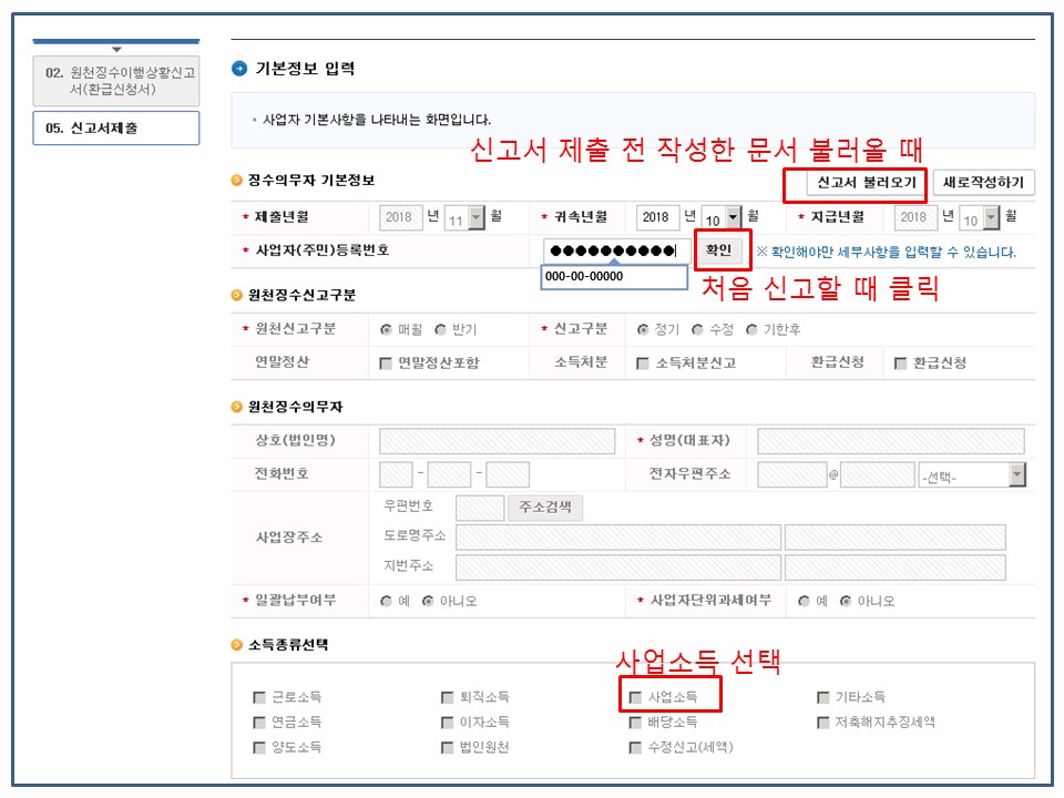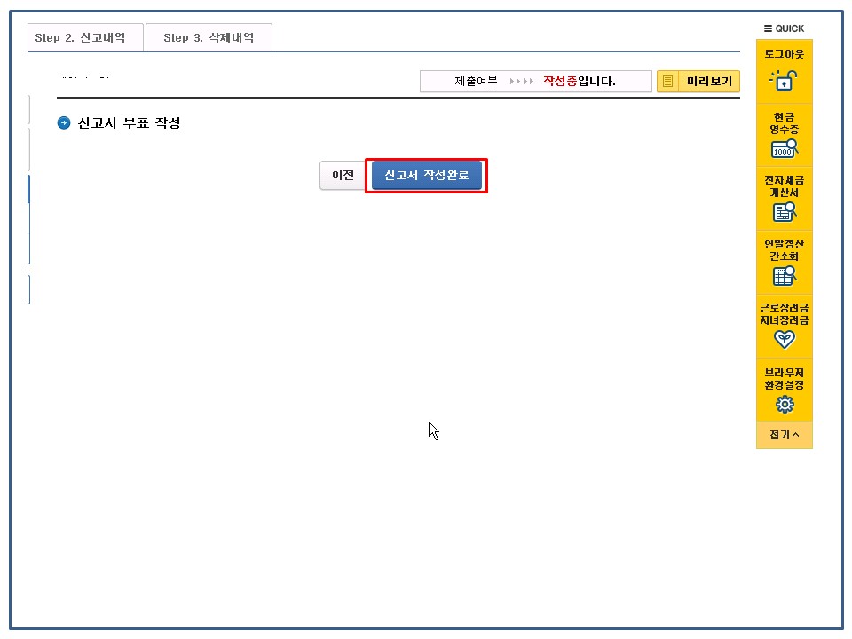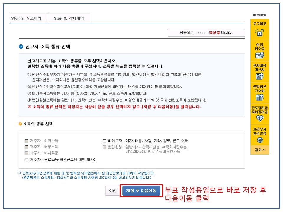 제가 직접 국세청 홈택스에 접속한 후 원천징수이행상황신고서를 작성한 것을 단계별로, 화면으로 캡처하여 올립니다.