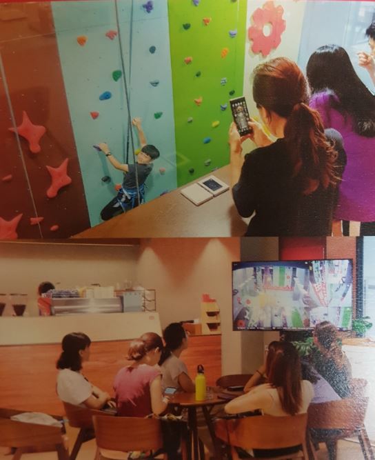 안전 장비에, 항상 지켜보는 안전요원까지 있어, 부모들은 블랙야크 매장 2층에 있는 커피숍에서 쉬면서 지켜볼 수 있다.