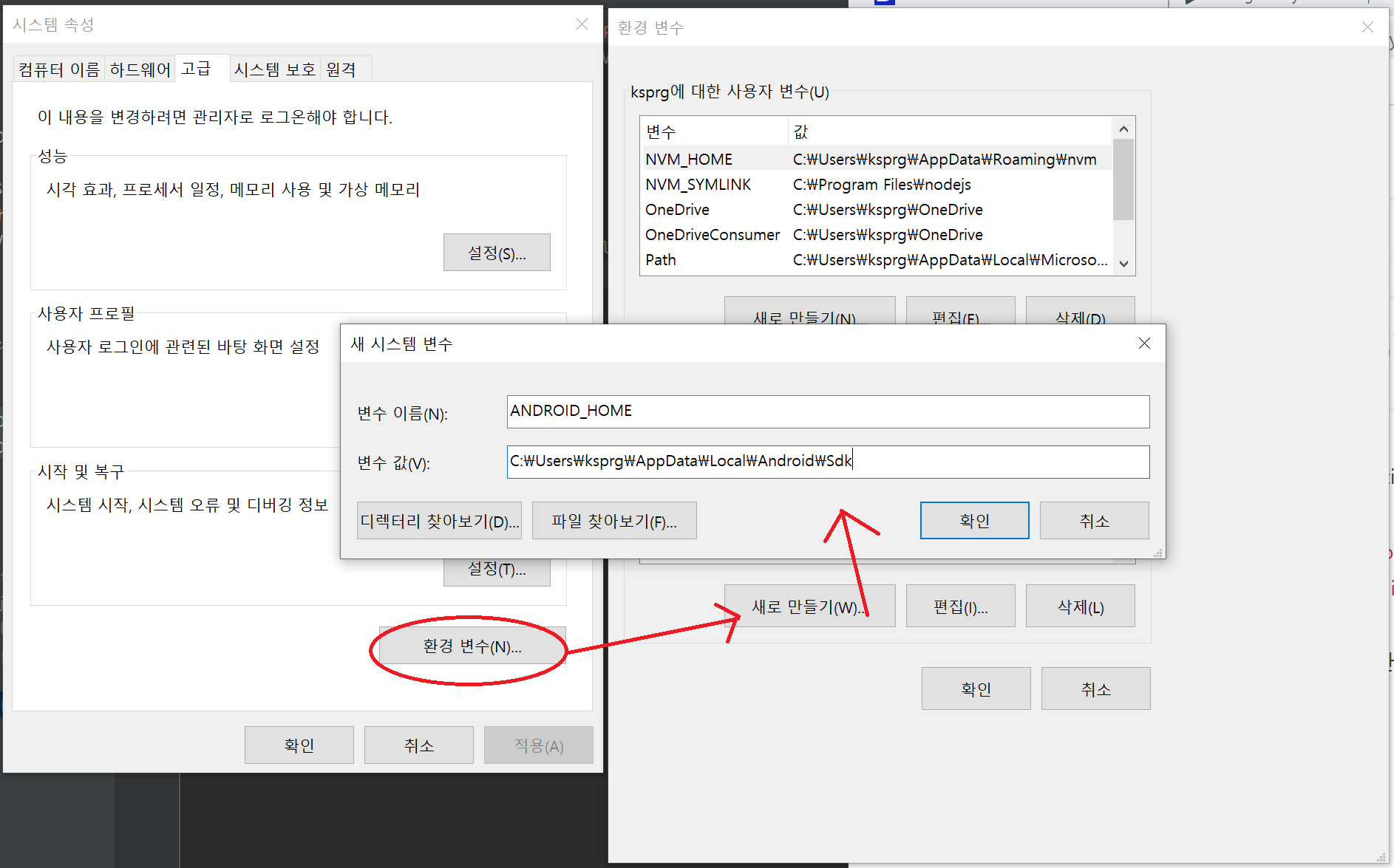 변수이름은 ANDROID_HOME 으로 변수 값은 local.properties 파일의 sdk.dir 에 설정되어 있는 경로를 등록해 주면 된다.