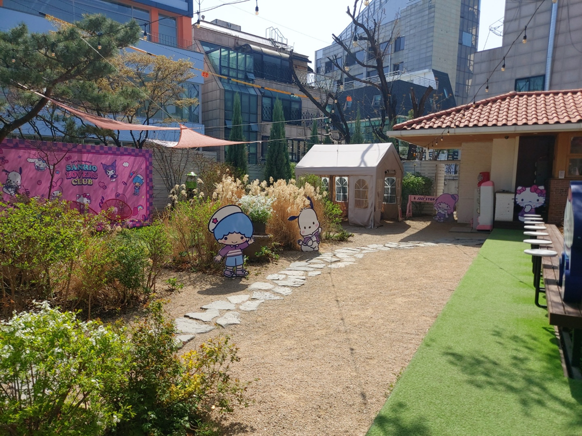 카페 밖 정원에서는 날이 좋아 사진찍기 더 없이 좋았다. 산리오 캐릭터를 정원 곳곳에 배치해두고 사진 찍을 수 있게 해놓아 한 곳도 놓칠 수 없었다. 사진찍기에 더 없이 흥겨웠던 날...
