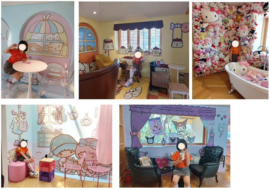 2층 카페는 이용예약을 네이버에서 해야만 가능한데, 카페는 각 캐릭터별로 구역이 꾸며져 있어 구석구석 곳곳에서 사진을 찍느라 정신없었다. 어른인 나도 카페에 있는 동안은 헬로키티 캐릭터에 빠져버렸다.